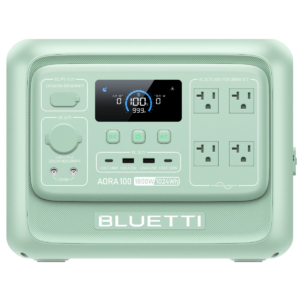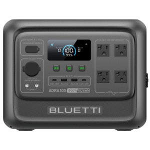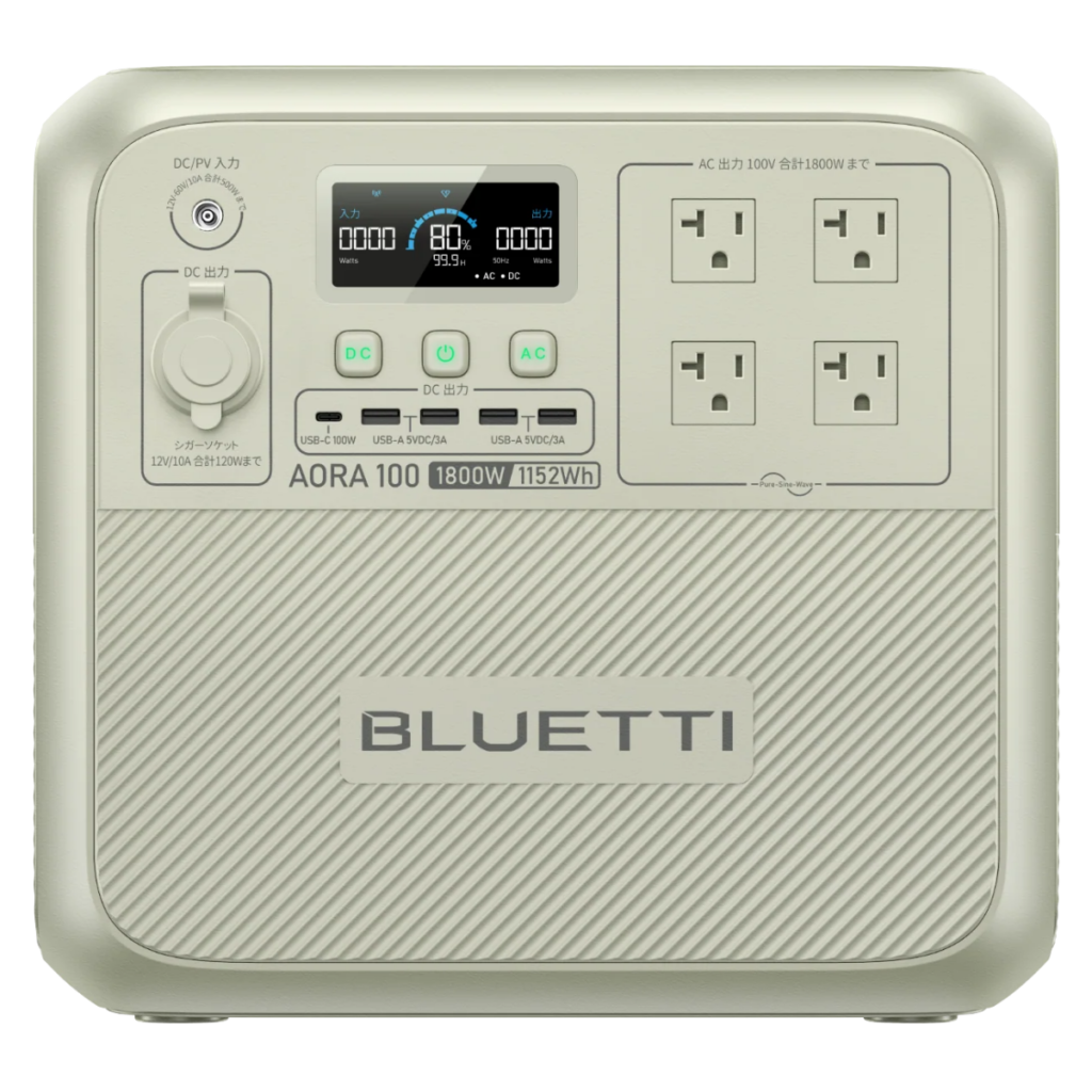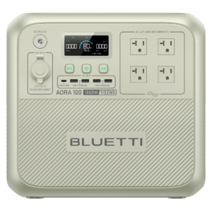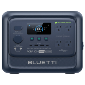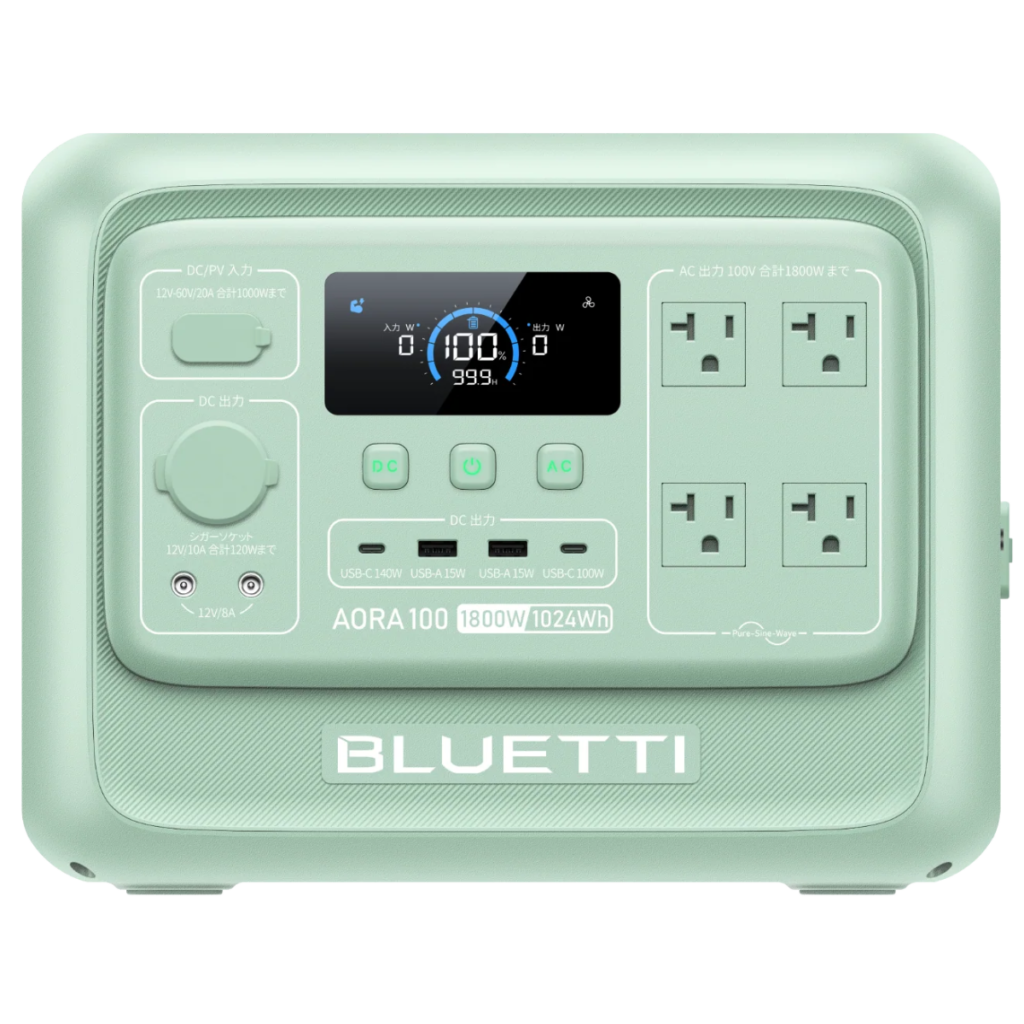 AORA 100 V2 は、Bluettiが展開する1000Whクラスのポータブル電源で、防災や日常使用、アウトドアまで幅広いシーンに対応できるモデルです。約1024Whの大容量バッテリーを搭載しながら、最大1500W前後の高い出力性能を実現しており、スマホ・ノートPCといったモバイル機器から、小型冷蔵庫やプロジェクターといった比較的高出力の家電まで安定して給電できます。