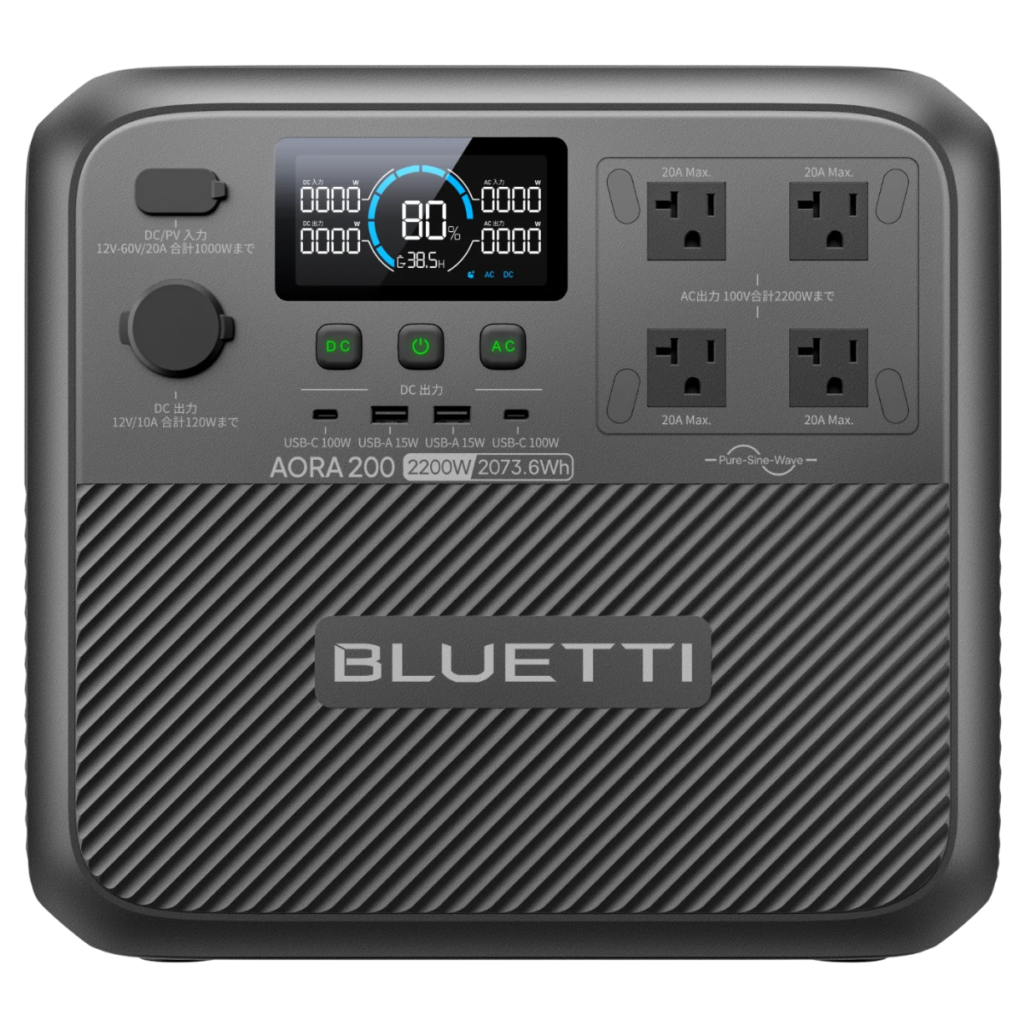 AORA 200(旧Elite 200 V2)は、Bluettiが展開する2000Whクラスの大容量ポータブル電源です。約2074Whの大容量を備えつつ、定格出力2200Wと高い出力性能を両立しており、家庭用の主要な電化製品からアウトドア、車中泊用機器まで幅広い用途で活躍します。