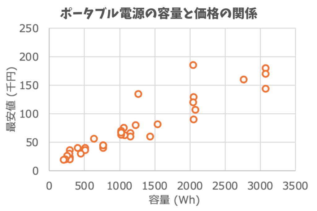 容量単価(円/Wh)が小さいほど、容量当たりの価格が安くコストパフォーマンスの高いポータブル電源と言えます。