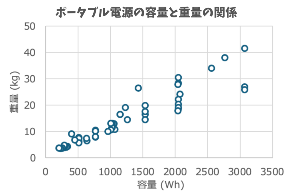 そこで、ポータブル電源の容量をポータブル電源の重さで割ってあげると「重さ当たりの容量(=重量エネルギー密度)」となり、横並びで比較できるようになります。